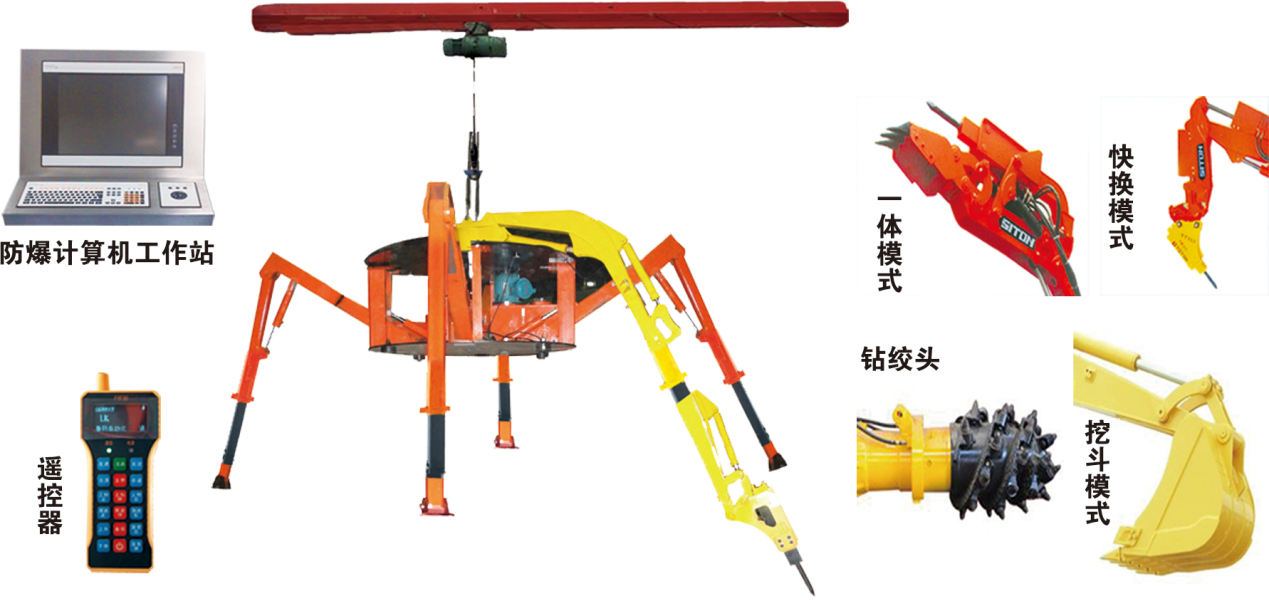 矿用煤仓清理机器人主要由三部分组成:双层平台遥控升降、支撑及工作液压臂、液控及监控系统组成。该机既适用于矿山地面洗煤厂(装车站)煤仓自动化清理、疏通,又适合于井下转运煤仓(岩仓)的机械化清理。有效解决各类煤仓蓬煤、粘壁、冻煤、堵仓等问题,全程视频监控,遥控作业,能够安全有效的替代人工作业,有效解决放炮、空气炮清理的安全问题。